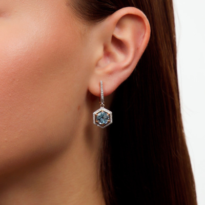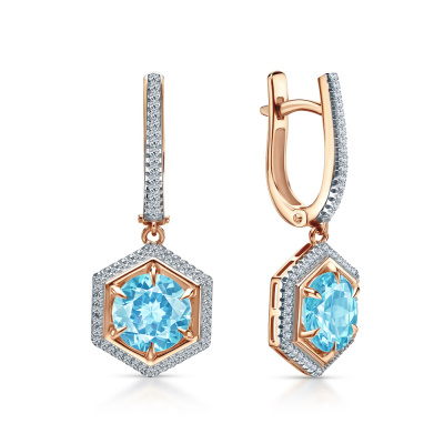 Серьги с 116 бриллиантами природными, 0.24 карат, огранка круг 17 граней, цвет 2, чистота 2, тип огранки А; 2 топазами скай природными, 4.53 карат, огранка круг чекер; Розовое золото 585 пробы.