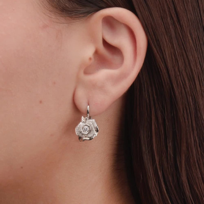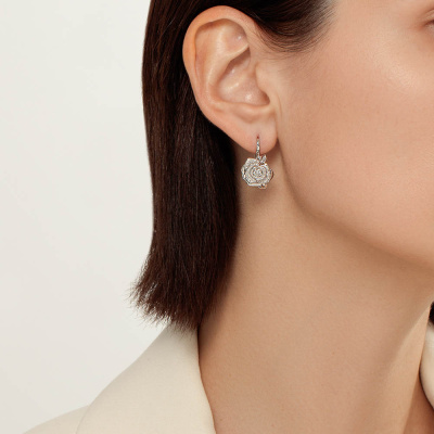 Серьги с 2 бриллиантами природными, 0.23 карат, огранка круг 57 граней, цвет 4, чистота 6, тип огранки А; 78 бриллиантами природными, 0.26 карат, огранка круг 17 граней, цвет 2, чистота 2, тип огранки А; Белое золото 585 пробы.