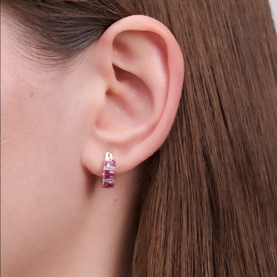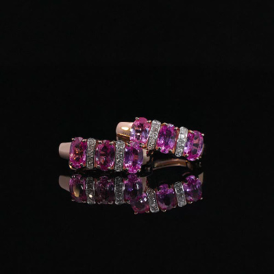 Серьги с 20 бриллиантами природными, 0.04 карат, огранка круг 17 граней, цвет 2, чистота 2, тип огранки А; 6 сапфирами розовыми природными, 1.52 карат, тип огранки Б; Розовое золото 585 пробы.