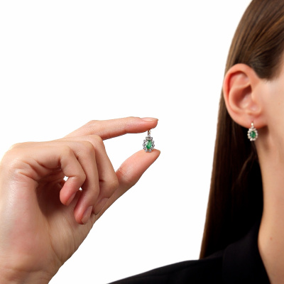 Серьги с 16 бриллиантами природными, 0.23 карат, огранка круг 57 граней, цвет 3, чистота 6, тип огранки А; 6 бриллиантами природными, 0.04 карат, огранка круг 57 граней, цвет 3, чистота 6, тип огранки А; 2 изумрудами природными, 0.85 карат, цвет 3, чистота 3, тип огранки Б; Желтое золото 585 пробы.