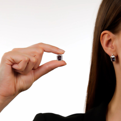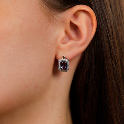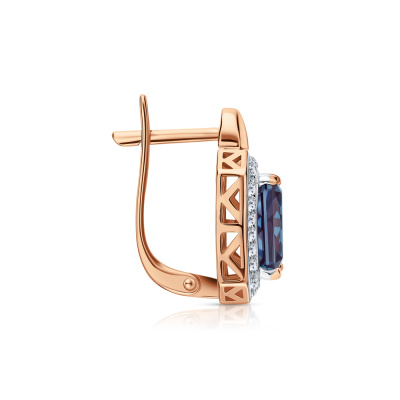 Серьги с 48 бриллиантами природными, 0.23 карат, огранка круг 17 граней, цвет 2, чистота 2, тип огранки А; 2 александритами синтетическими, 3.42 карат; Розовое золото 585 пробы.
