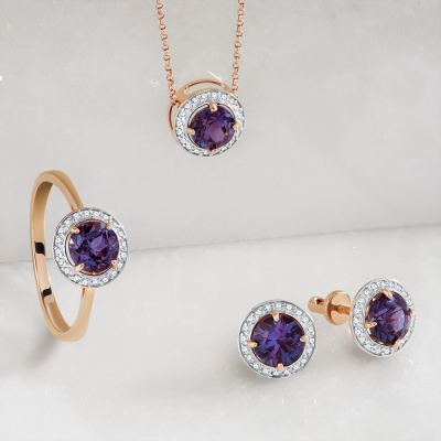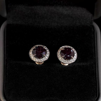 Серьги с 40 бриллиантами природными, 0.12 карат, огранка круг 17 граней, цвет 2, чистота 2, тип огранки А; 2 александритами синтетическими, 1.92 карат; Розовое золото 585 пробы.