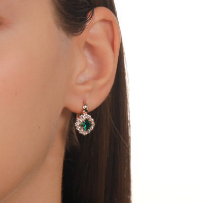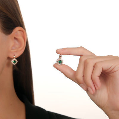 Серьги с 2 гидротермальными изумрудами, 0.99 карат; 24 сапфирами бесцветными природными, 0.83 карат; Розовое золото 585 пробы.