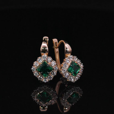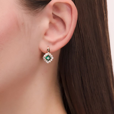 Серьги с 2 гидротермальными изумрудами, 1.07 карат; 24 сапфирами бесцветными природными, 0.83 карат; Розовое золото 585 пробы.