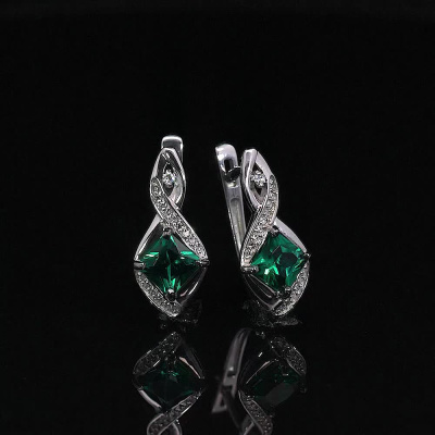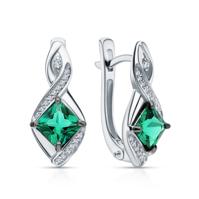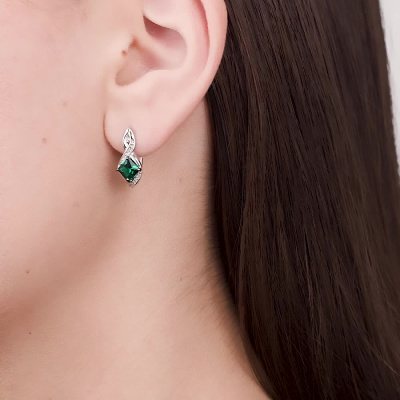 Серьги с 2 бриллиантами природными, 0.01 карат, огранка круг 17 граней, цвет 2, чистота 2, тип огранки А; 30 бриллиантами природными, 0.06 карат, огранка круг 17 граней, цвет 2, чистота 2, тип огранки А; 2 гидротермальными изумрудами, 1.09 карат; Белое золото 585 пробы.