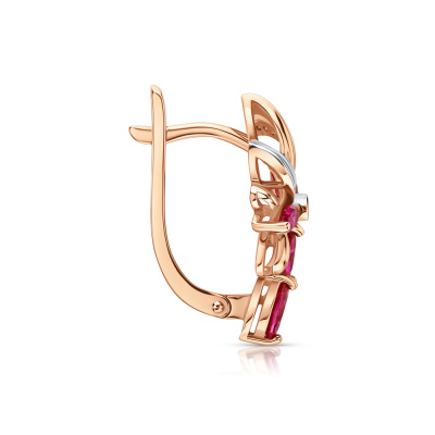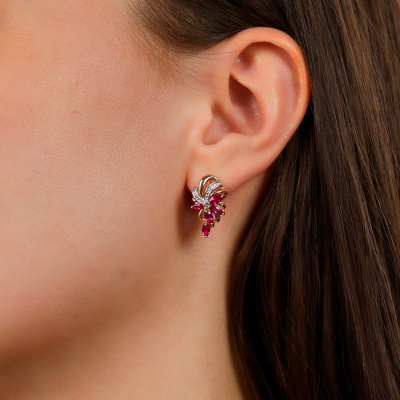 Серьги с 2 бриллиантами природными, 0.01 карат, огранка круг 17 граней, цвет 2, чистота 2, тип огранки А; 32 бриллиантами природными, 0.06 карат, огранка круг 17 граней, цвет 2, чистота 2, тип огранки А; 8 рубинами синтетическими, 1.16 карат; 2 рубинами синтетическими, 0.16 карат; Розовое золото 585 пробы.