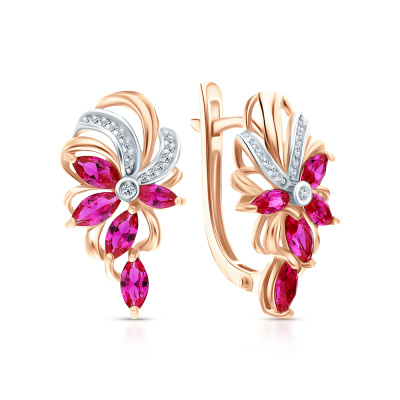 Серьги с 2 бриллиантами природными, 0.01 карат, огранка круг 17 граней, цвет 2, чистота 2, тип огранки А; 32 бриллиантами природными, 0.06 карат, огранка круг 17 граней, цвет 2, чистота 2, тип огранки А; 8 рубинами синтетическими, 1.15 карат; 2 рубинами синтетическими, 0.17 карат; Розовое золото 585 пробы.