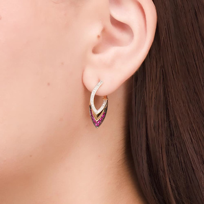 Серьги с 50 бриллиантами природными, 0.13 карат, огранка круг 17 граней, цвет 2, чистота 2, тип огранки А; 10 рубинами природными, 0.25 карат, цвет 2, чистота 2, тип огранки В; 4 рубинами природными, 0.06 карат, цвет 2, чистота 2, тип огранки В; 4 рубинами природными, 0.03 карат, цвет 2, чистота 2, тип огранки В; 2 рубинами природными, 0.01 карат, цвет 2, чистота 2, тип огранки В; Желтое золото 585 пробы.