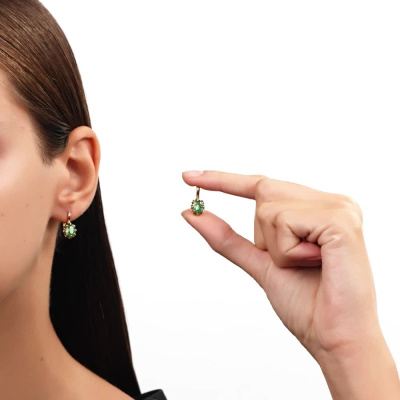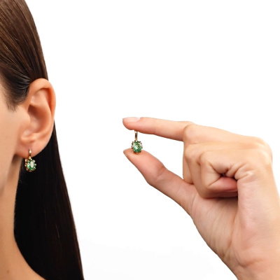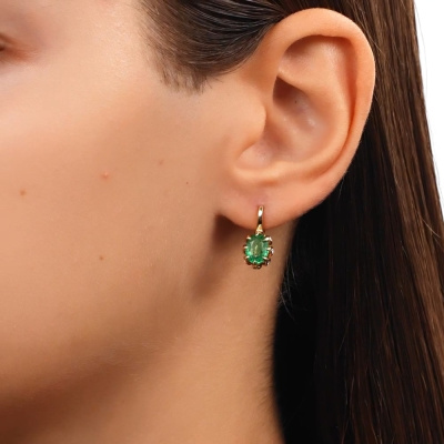 Серьги с 16 бриллиантами природными, 0.06 карат, огранка круг 17 граней, цвет 2, чистота 2, тип огранки А; 2 изумрудами природными, 2.12 карат, цвет 3, чистота 3, тип огранки Б; Желтое золото 585 пробы.