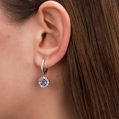 Серьги с 18 бриллиантами природными, 0.18 карат, огранка круг 57 граней, цвет 3, чистота 6, тип огранки А; 2 танзанитами природными, 1.67 карат; 24 сапфирами бесцветными природными, 1.04 карат; Белое золото 585 пробы.