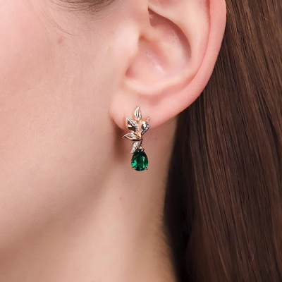 Серьги с 16 бриллиантами природными, 0.06 карат, огранка круг 17 граней, цвет 2, чистота 2, тип огранки А; 16 бриллиантами природными, 0.03 карат, огранка круг 17 граней, цвет 2, чистота 2, тип огранки А; 2 гидротермальными изумрудами, 1.84 карат; Розовое золото 585 пробы.