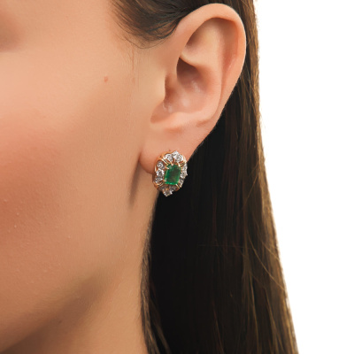 Серьги с 8 бриллиантами природными, 0.44 карат, огранка круг 57 граней, цвет 3, чистота 6, тип огранки А; 16 бриллиантами природными, 0.12 карат, огранка круг 57 граней, цвет 3, чистота 6, тип огранки А; 2 изумрудами природными, 1.76 карат, цвет 3, чистота 3, тип огранки Б; Желтое золото 585 пробы.