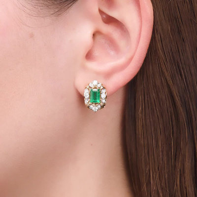 Серьги с 8 бриллиантами природными, 0.44 карат, огранка круг 57 граней, цвет 3, чистота 6, тип огранки А; 16 бриллиантами природными, 0.12 карат, огранка круг 57 граней, цвет 3, чистота 6, тип огранки А; 2 изумрудами природными, 1.75 карат, цвет 3, чистота 3, тип огранки Б; Желтое золото 585 пробы.