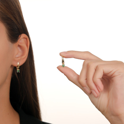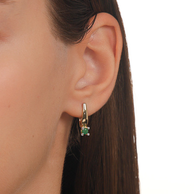 Серьги с 8 бриллиантами природными, 0.02 карат, огранка круг 17 граней, цвет 2, чистота 2, тип огранки А; 2 изумрудами природными, 0.31 карат, цвет 3, чистота 3, тип огранки В; Желтое золото 585 пробы.