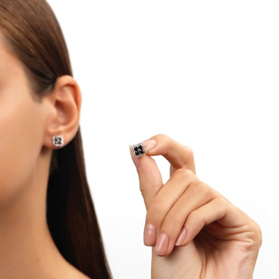 Серьги с 48 бриллиантами природными, 0.13 карат, огранка круг 17 граней, цвет 2, чистота 2, тип огранки А; 8 сапфирами природными, 0.8 карат, цвет 2, чистота 2, тип огранки В; Белое золото 585 пробы.