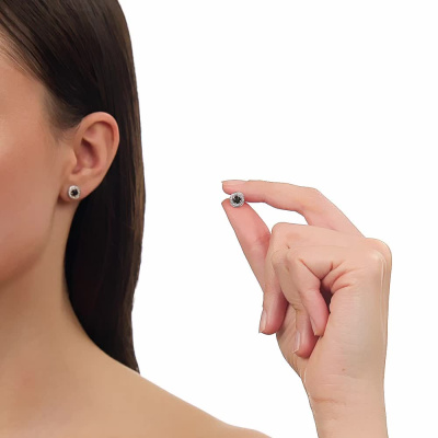 Серьги с 30 бриллиантами природными, 0.08 карат, огранка круг 17 граней, цвет 2, чистота 2, тип огранки А; 2 сапфирами природными, 0.47 карат, цвет 2, чистота 2, тип огранки В; Белое золото 585 пробы.