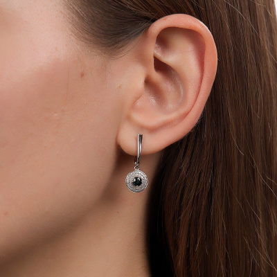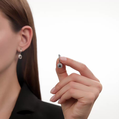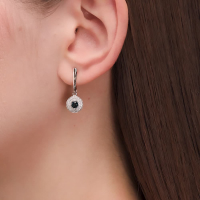 Серьги с 72 бриллиантами природными, 0.2 карат, огранка круг 17 граней, цвет 2, чистота 2, тип огранки А; 2 сапфирами природными, 0.54 карат, цвет 2, чистота 2, тип огранки В; Белое золото 585 пробы.