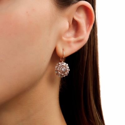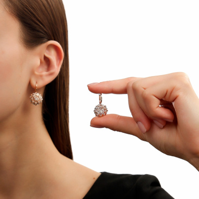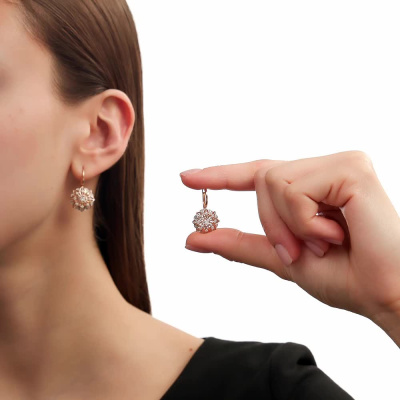 Серьги с 2 бриллиантами природными, 0.15 карат, огранка круг 57 граней, цвет 3, чистота 6, тип огранки А; 16 бриллиантами природными, 0.11 карат, огранка круг 57 граней, цвет 3, чистота 6, тип огранки А; 16 бриллиантами природными, 0.05 карат, огранка круг 17 граней, цвет 2, чистота 2, тип огранки А; Розовое золото 585 пробы.