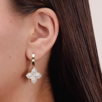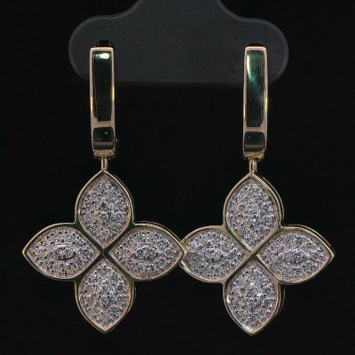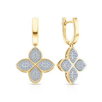Серьги с 96 бриллиантами природными, 0.65 карат, огранка круг 57 граней, цвет 3, чистота 6, тип огранки А; Желтое золото 585 пробы.
