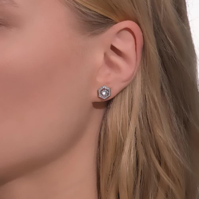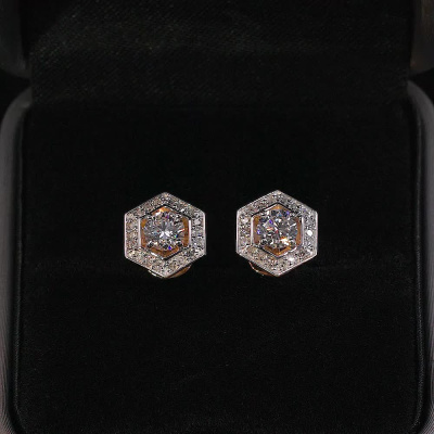 Серьги с 2 бриллиантами природными, 0.61 карат, огранка круг 57 граней, цвет 3, чистота 6, тип огранки А; 36 бриллиантами природными, 0.15 карат, огранка круг 17 граней, цвет 2, чистота 2, тип огранки А; Розовое золото 585 пробы.