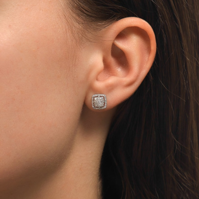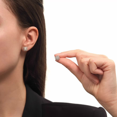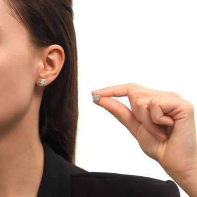 Серьги с 2 бриллиантами природными, 0.03 карат, огранка круг 57 граней, цвет 3, чистота 6, тип огранки А; 32 бриллиантами природными, 0.17 карат, огранка круг 17 граней, цвет 2, чистота 2, тип огранки А; 64 бриллиантами природными, 0.11 карат, огранка круг 17 граней, цвет 2, чистота 2, тип огранки А; Белое золото 585 пробы.