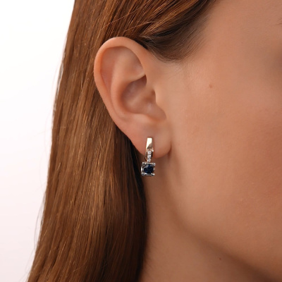 Серьги с 6 бриллиантами природными, 0.1 карат, огранка круг 57 граней, цвет 3, чистота 6, тип огранки А; 2 сапфирами природными, 1.02 карат, цвет 5, чистота 3, тип огранки В; Розовое и белое золото 585 пробы.