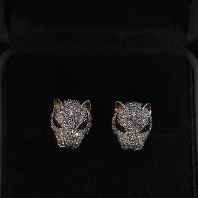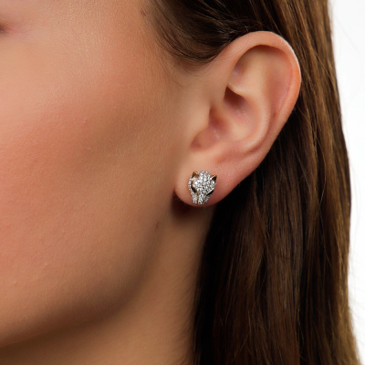 Серьги с 94 бриллиантами природными, 0.7 карат, огранка круг 57 граней, цвет 4, чистота 6, тип огранки А; 40 бриллиантами природными, 0.15 карат, огранка круг 17 граней, цвет 2, чистота 3, тип огранки Б; 4 бриллиантами черными природными облагороженными, 0.06 карат, огранка круг 57 граней, цвет 7, чистота 6, тип огранки А; Желтое золото 585 пробы.