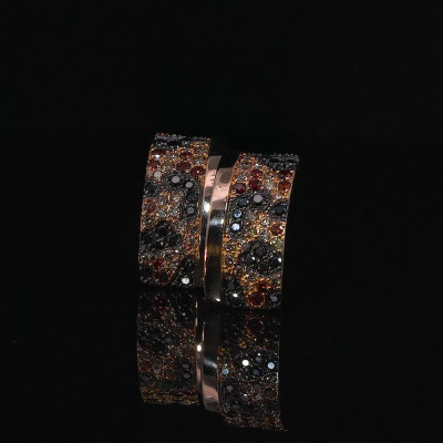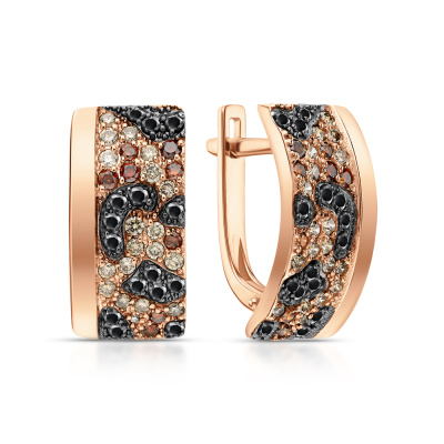 Серьги с 8 бриллиантами черными природными облагороженными, 0.11 карат, огранка круг 57 граней, цвет 7, чистота 6, тип огранки А; 8 бриллиантами коричневыми природнымиоблагороженными, 0.11 карат, огранка круг 57 граней, цвет 5, чистота 4, тип огранки А; 10 бриллиантами коньячными природными, 0.13 карат, огранка круг 57 граней, цвет 7, чистота 6, тип огранки А; 8 бриллиантами коричневыми природнымиоблагороженными, 0.07 карат, огранка круг 57 граней, цвет 5, чистота 4, тип огранки А; 22 бриллиантами черными природными облагороженными, 0.21 карат, огранка круг 57 граней, цвет 7, чистота 6, тип огранки А; 26 бриллиантами коньячными природными, 0.24 карат, огранка круг 57 граней, цвет 7, чистота 6, тип огранки А; 2 бриллиантами коньячными природными, 0.006 карат, огранка круг 57 граней, цвет 7, чистота 6, тип огранки А; Розовое золото 585 пробы.