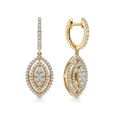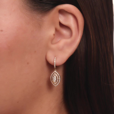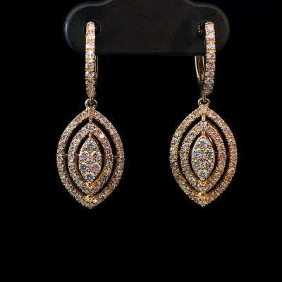 Серьги с 12 бриллиантами природными, 0.18 карат, огранка круг 57 граней, цвет 3, чистота 5, тип огранки А; 130 бриллиантами природными, 0.57 карат, огранка круг 17 граней, цвет 3, чистота 4, тип огранки Б; Желтое золото 585 пробы.