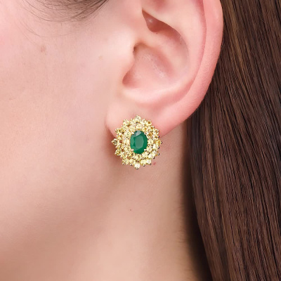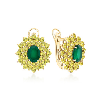Серьги с 72 сапфирами желтыми природными, 4.19 карат; 2 агатами зелеными природными; Желтое золото 585 пробы.