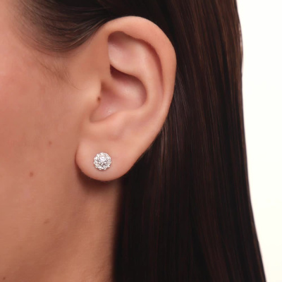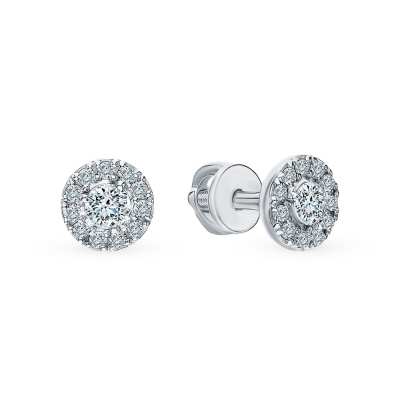 Серьги с 2 бриллиантами природными, 0.21 карат, огранка круг 57 граней, цвет 4, чистота 5, тип огранки А; 22 бриллиантами природными, 0.15 карат, огранка круг 17 граней, цвет 2, чистота 2, тип огранки А; Белое золото 585 пробы.