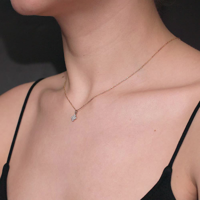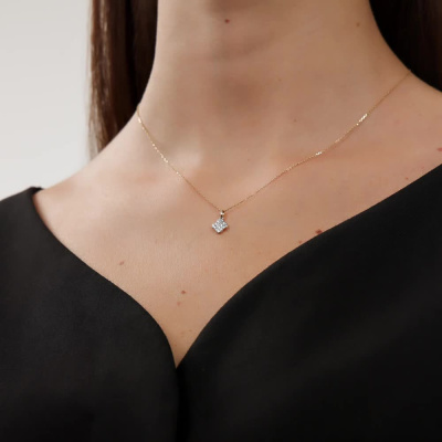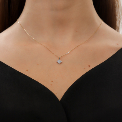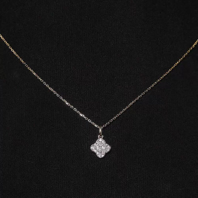 Шейное укр. с 16 бриллиантами природными, 0.14 карат, огранка круг 57 граней, цвет 4, чистота 6, тип огранки А; Желтое золото 585 пробы.