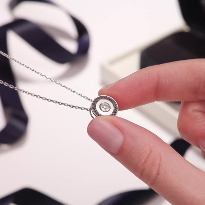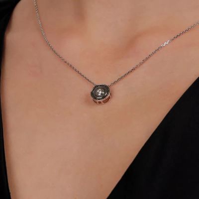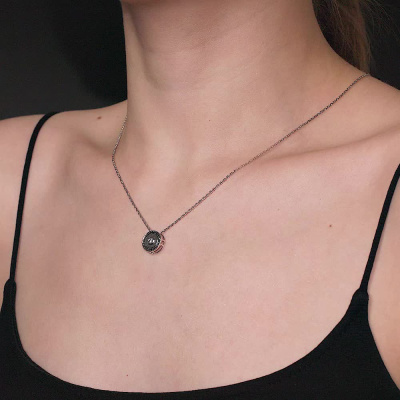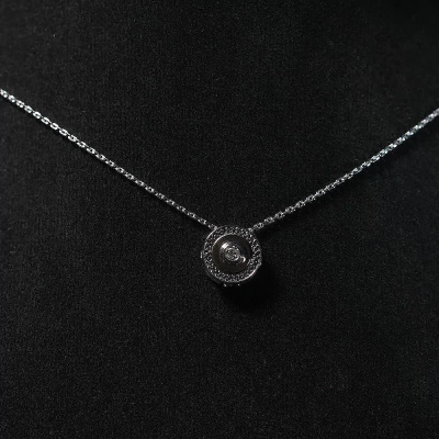 Шейное укр. с 1 бриллиантом природным, 0.09 карат, огранка круг 57 граней, цвет 4, чистота 5, тип огранки А; 30 бриллиантами черными природными облагороженными, 0.1 карат, огранка круг 57 граней, цвет 7, чистота 6, тип огранки А; Белое золото 585 пробы.