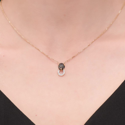 Шейное укр. с 12 бриллиантами природными, 0.04 карат, огранка круг 17 граней, цвет 2, чистота 3, тип огранки А; 2 бриллиантами черными природными облагороженными, 0.01 карат, огранка круг 57 граней, цвет 7, чистота 6, тип огранки А; 19 бриллиантами черными природными облагороженными, 0.07 карат, огранка круг 57 граней, цвет 7, чистота 6, тип огранки А; 2 изумрудами природными, 0.005 карат, цвет 3, чистота 3, тип огранки В; Желтое золото 585 пробы.