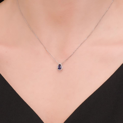 Шейное укр. с 22 бриллиантами природными, 0.04 карат, огранка круг 17 граней, цвет 2, чистота 2, тип огранки А; 1 сапфиром выращенным, 0.51 карат; Белое золото 585 пробы.