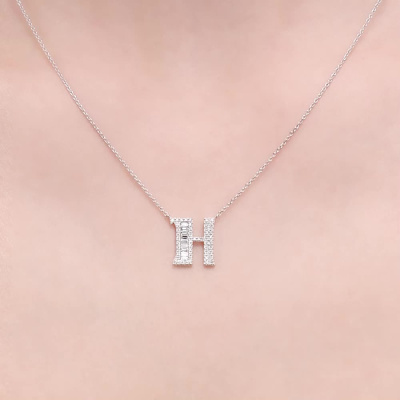 Шейное укр. с 9 бриллиантами выращенными, 0.14 карат, огранка багет 25 граней, цвет 3, чистота 5, тип огранки А; 52 бриллиантами выращенными, 0.14 карат, огранка круг 57 граней, цвет 3, чистота 5, тип огранки А; Белое золото 585 пробы.