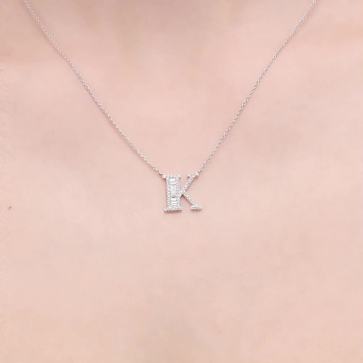 Шейное укр. с 9 бриллиантами выращенными, 0.13 карат, огранка багет 25 граней, цвет 3, чистота 5, тип огранки А; 45 бриллиантами выращенными, 0.12 карат, огранка круг 57 граней, цвет 3, чистота 5, тип огранки А; Белое золото 585 пробы.