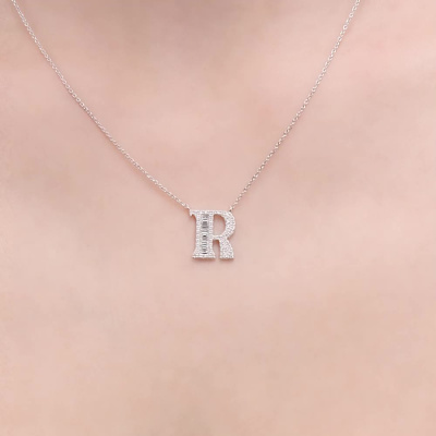 Шейное укр. с 9 бриллиантами выращенными, 0.14 карат, огранка багет 25 граней, цвет 3, чистота 5, тип огранки А; 56 бриллиантами выращенными, 0.15 карат, огранка круг 57 граней, цвет 3, чистота 5, тип огранки А; Белое золото 585 пробы.