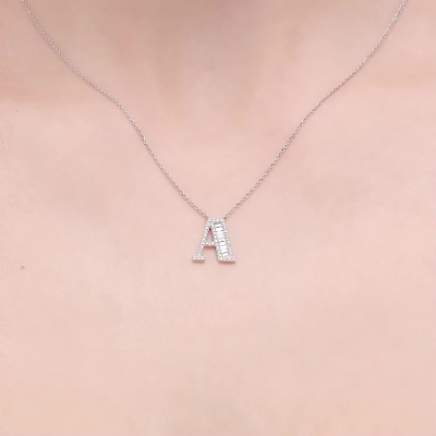 Шейное укр. с 9 бриллиантами выращенными, 0.13 карат, огранка багет 25 граней, цвет 3, чистота 5, тип огранки А; 40 бриллиантами выращенными, 0.11 карат, огранка круг 57 граней, цвет 3, чистота 5, тип огранки А; Белое золото 585 пробы.