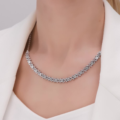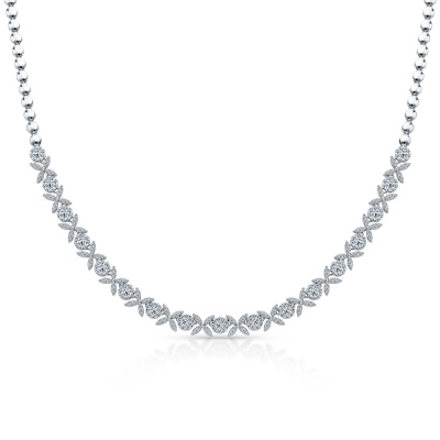 Шейное укр. с 17 бриллиантами природными, 1.31 карат, огранка круг 57 граней, цвет 3, чистота 6, тип огранки А; 200 бриллиантами природными, 2.22 карат, огранка круг 57 граней, цвет 3, чистота 6, тип огранки А; 128 бриллиантами природными, 0.43 карат, огранка круг 57 граней, цвет 3, чистота 6, тип огранки А; Белое золото 585 пробы.