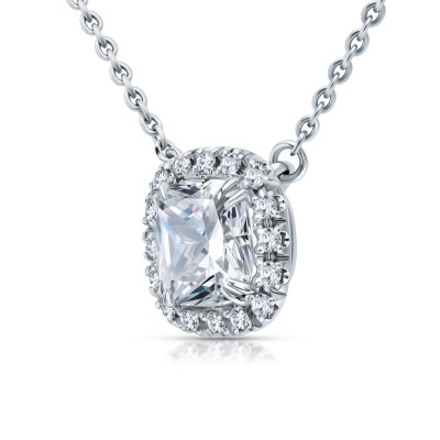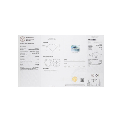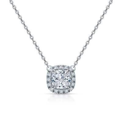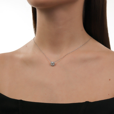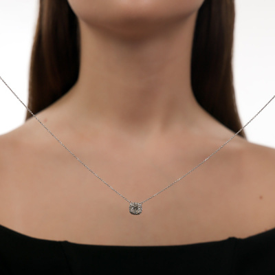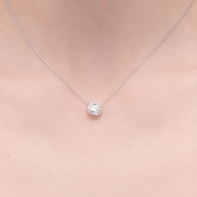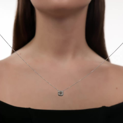 Шейное укр. с 1 бриллиантом выращенным, 1.05 карат, огранка кушон 57 граней, цвет 4, чистота 5, тип огранки А; 16 бриллиантами выращенными, 0.12 карат, огранка круг 57 граней, цвет 3, чистота 5, тип огранки А; Белое золото 585 пробы.