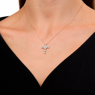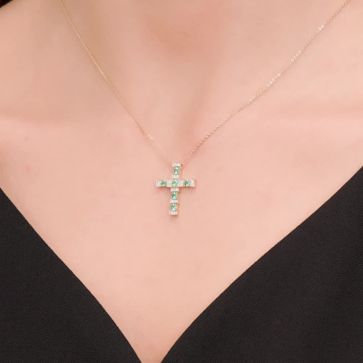 Шейное укр. с 18 бриллиантами природными, 0.07 карат, огранка круг 57 граней, цвет 3, чистота 6, тип огранки А; 6 изумрудами природными, 0.29 карат, цвет 3, чистота 3, тип огранки В; Желтое золото 585 пробы.