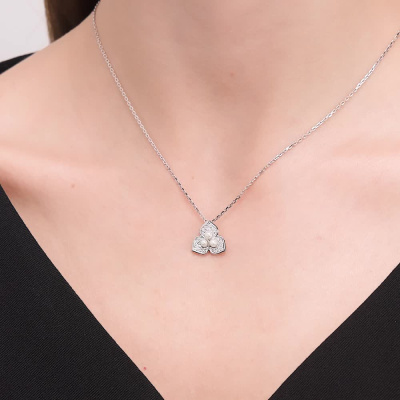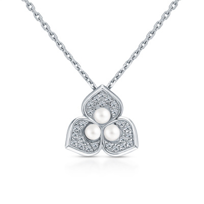 Шейное укр. с 24 бриллиантами природными, 0.16 карат, огранка круг 57 граней, цвет 3, чистота 5, тип огранки А; 3 жемчугами пресноводными культ.белыми, 0.39 карат, тип огранки В; Белое золото 585 пробы.