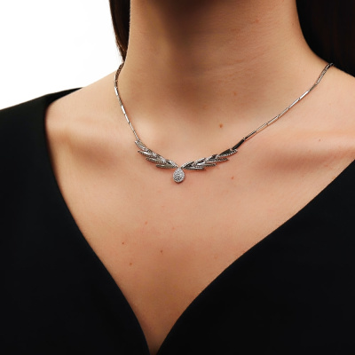 Шейное укр. с 123 бриллиантами природными, 0.43 карат, огранка круг 17 граней, цвет 2, чистота 2, тип огранки А; 25 бриллиантами природными, 0.04 карат, огранка круг 17 граней, цвет 2, чистота 2, тип огранки А; Белое золото 585 пробы.