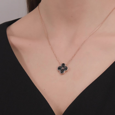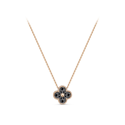 Шейное укр. с 4 бриллиантами черными природными облагороженными, 0.55 карат, огранка круг 57 граней, цвет 7, чистота 6, тип огранки А; 8 бриллиантами черными природными облагороженными, 0.27 карат, огранка круг 57 граней, цвет 7, чистота 6, тип огранки А; Розовое золото 585 пробы.