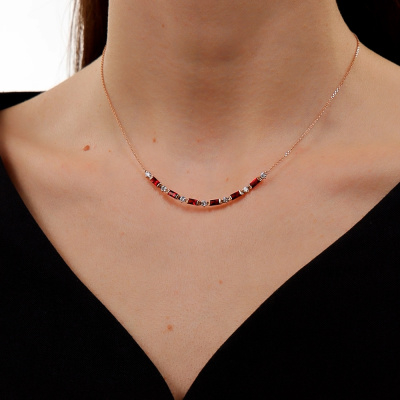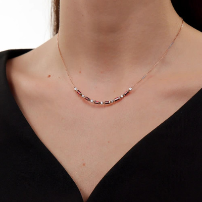 Шейное укр. с 7 бриллиантами природными, 0.43 карат, огранка круг 57 граней, цвет 4, чистота 5, тип огранки А; 6 гранатами природными, 1.37 карат; Розовое золото 585 пробы.