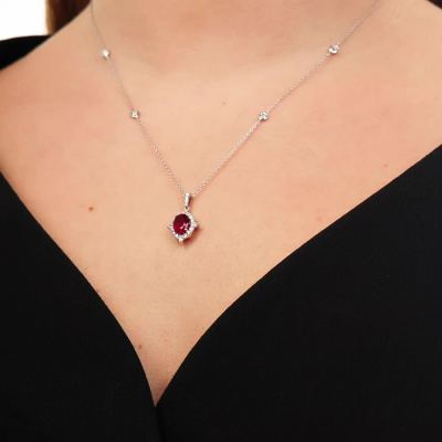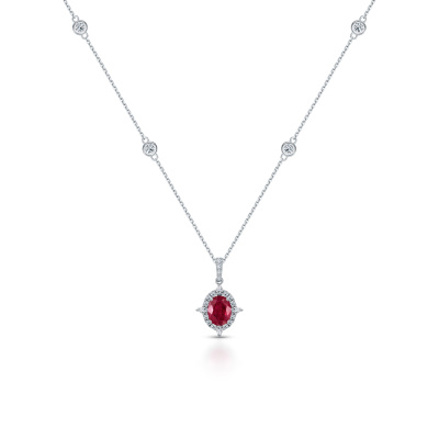 Шейное укр. с 4 бриллиантами природными, 0.11 карат, огранка груша 56 граней, цвет 3, чистота 5, тип огранки А; 20 бриллиантами природными, 0.51 карат, огранка круг 57 граней, цвет 3, чистота 4, тип огранки А; 1 рубином природным, 2.23 карат, цвет 2, чистота 3, тип огранки Б; Белое золото 585 пробы.