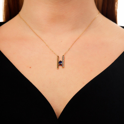 Шейное укр. с 11 бриллиантами природными, 0.18 карат, огранка круг 57 граней, цвет 6, чистота 6, тип огранки А; 1 сапфиром природным, 0.71 карат, цвет 2, чистота 2, тип огранки Б; Желтое золото 585 пробы.