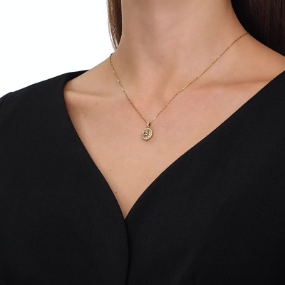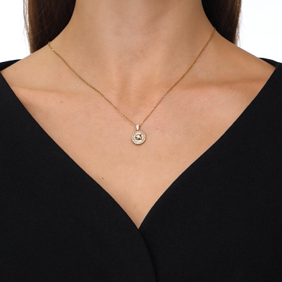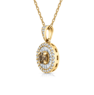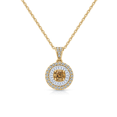 Шейное укр. с 1 бриллиантом природным, 0.35 карат, огранка круг 57 граней, цвет 9-2, чистота 6, тип огранки А; 22 бриллиантами природными, 0.56 карат, огранка багет 33 грани, цвет 3, чистота 3, тип огранки А; 32 бриллиантами природными, 0.18 карат, огранка круг 57 граней, цвет 3, чистота 4, тип огранки А; Желтое золото 585 пробы.