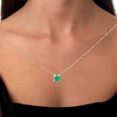 Шейное укр. с 1 изумрудом выращенным Колумбия, 1.44 карат; 4 бриллиантами выращенными, 0.45 карат, огранка багет 33 грани, цвет 3, чистота 6, тип огранки А; 8 бриллиантами выращенными, 0.13 карат, огранка круг 57 граней, цвет 3, чистота 6, тип огранки А; Белое золото 585 пробы.